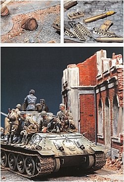 Das Modell eines Militärfahrzeugs kann für sich alleine auf einem einfachen Sockel oder eingebunden in eine szenische Umgebung präsentiert werden. Diese letzte Form der Darstellung, die das Fahrzeug mit Figuren, Gebäuden oder einer Landschaft kombiniert, ist das Diorama. Die Gründe dafür, ein Diorama zu bauen sind vielfältig: einer davon ist der Wunsch, das Fahrzeug einfach noch lebensnäher darzustellen. So geschehen beim Diorama mit dem Sd.Kfz. 251/10 in dem das Halbkettenfahrzeug eindeutig im Mittelpunkt einer Szene steht, die es in einem seiner Einsatzgebiete zeigt. Es ist gerade dabei, eine Brücke zu überqueren, wie es auch auf einem historischen Foto zu sehen ist. Dieses Diorama lässt den Betrachter einen Hauch der damaligen Atmosphäre schnuppern, als in Nordafrika um, die Zukunft Europas gekämpft wurde. Panzersperren, Stacheldraht und Graben machen dies deutlich. Auch das zweite Diorama, das um ein StuG III G aufgebaut ist, hat einen engen historischen Bezug, der sogar noch deutlich weiter geht. Dabei wurde eine Szene realisiert. die eine mehrfach dokumentierte Situation sehr authentisch nachstellt. Der Betrachter bekommt einen beklemmenden Eindruck von der Zerstörung einer Stadt, die zum Kampfgebiet geworden ist. Trümmer, Schutt und Ruinen stellen die Umgebung dar, in der die Soldaten am Ende nur noch um das Überleben kämpften. Eine sehr eindrucksvolle Szene, die auch zum Nachdenken anregt. Das dritte Diorama in diesem Band behandelt schließlich ein sehr bedeutendes historisches Ereignis: die Schlacht um Berlin, Hier war das Ziel, eine Szene zu gestalten, die sich plausibel in das damalige Geschehen einfügen lässt. Das Diorama lebt dabei auch vom Zusammenspiel der Figuren, die in einer regelrechten Inszenierung die Handlung der Szene verdeutlichen. So hat der Betrachter den Eindruck, einen kleinen Ausschnitt der Geschichte mitzuerleben. Ein Diorama zu erstellen, ist mit großem Zeitaufwand und viel Mühe verbunden. Doch erhält der Modellbauer damit die Möglichkeit etwas zu schaffen, das weit über eine reine maßstäbliche Darstellung hinausgeht. Welche Überlegungen dem Bau eines Dioramas vorausgehen müssen, mit welchen Techniken und Methoden man arbeiten kann und wie stark die Gestaltung die Wirkung beeinflusst, soll mit Hilfe der drei Beispiele in diesem Band erläutert werden.